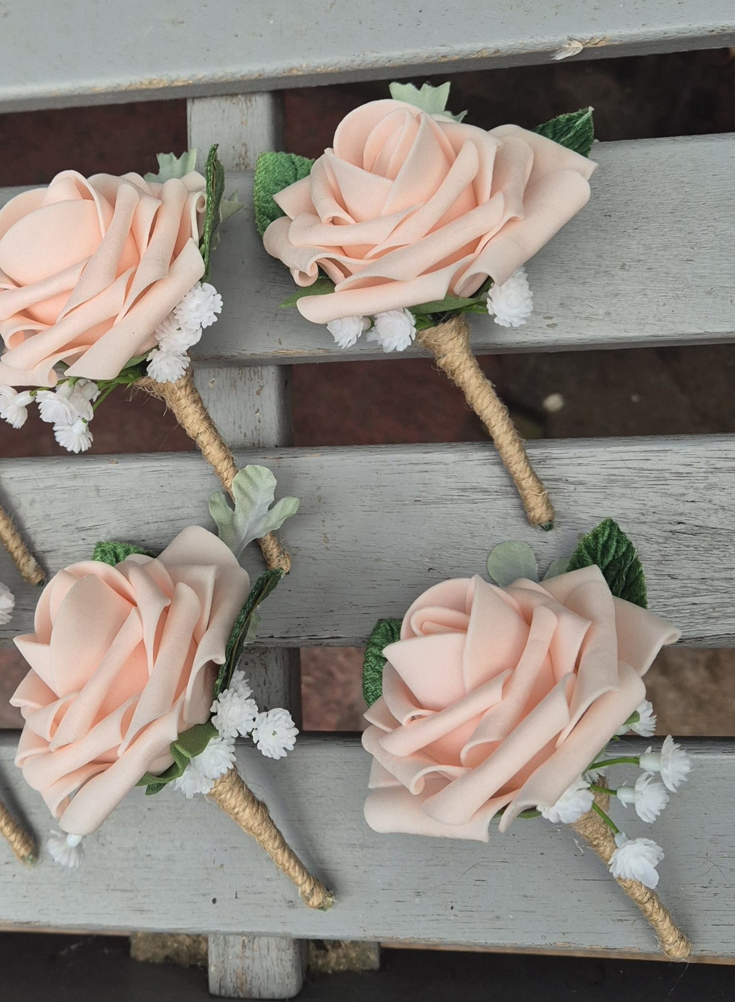 Foam buttonholes with a colour rose of your choice and a hessian wrapped stem.